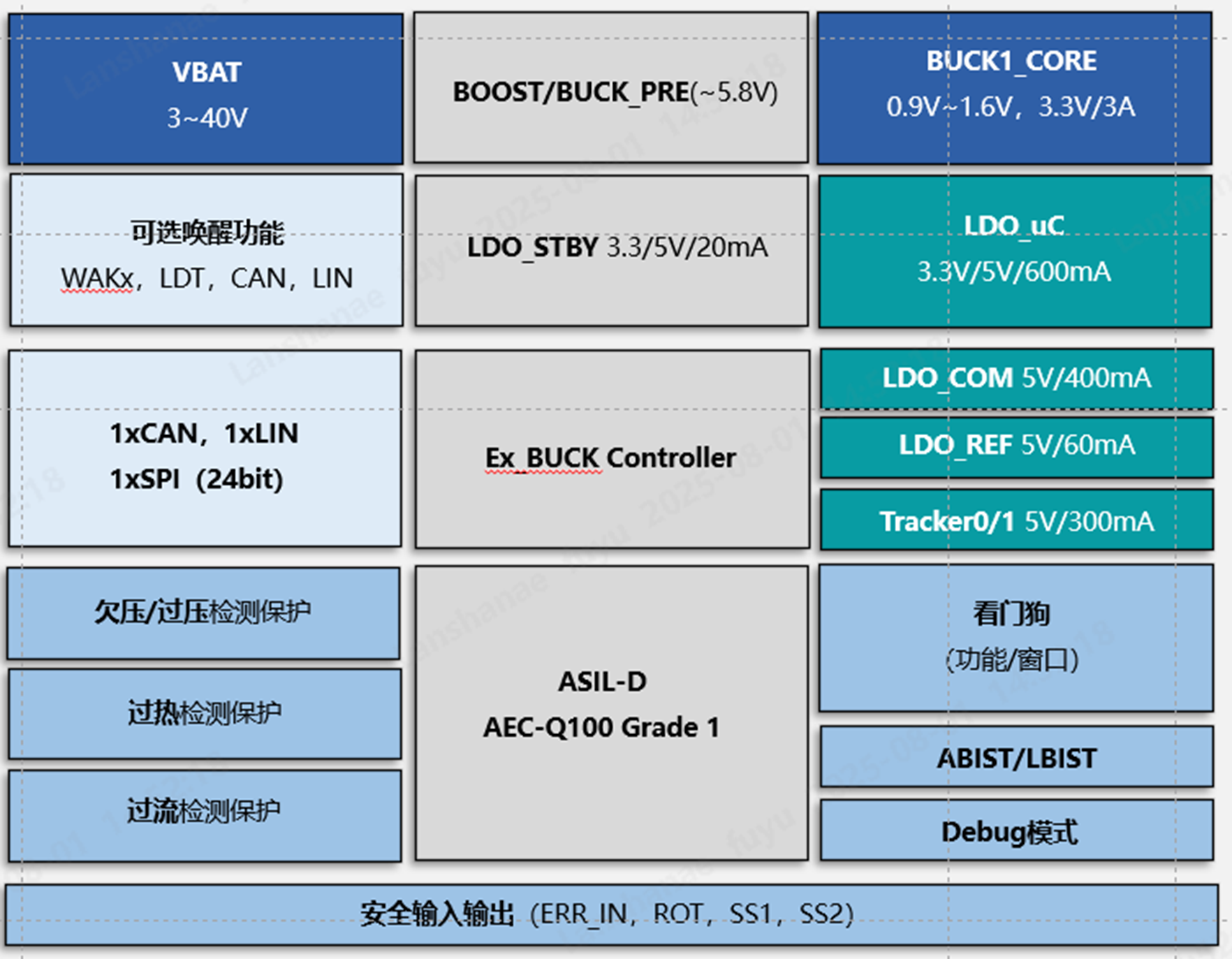 芯片可以提供多路Buck、LDO、Tracker、参考电源和CAN、LIN通讯接口,并内置独立电压监控模块,进行欠压、过压、过温及过流保护。