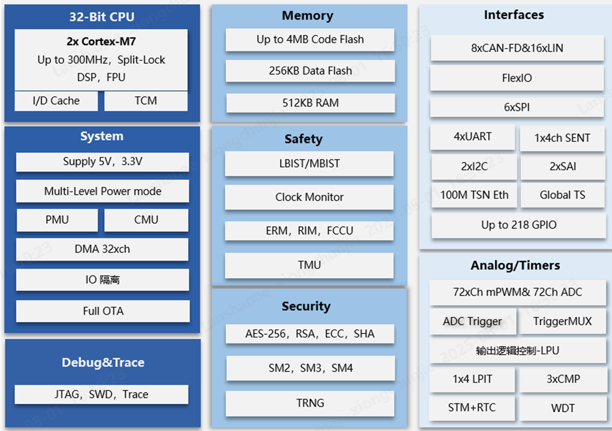 Equipped with ARM CORTEX M7 core, with a clock frequency of up to 300 MHz, one Ethernet port with TSN support function, 8 CANFD channels, and configured with motor output logic control